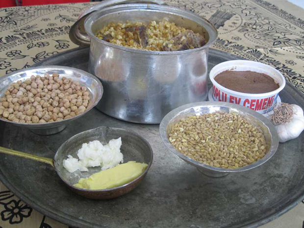 Nohut bir gece önceden sıcak su ile ıslatılır. Etle birlikte büyük bir tencereye konulup nohutlar hafif yumuşayana kadar haşlanır. İçine yarma eklenir. Eğer et suyu yeterli gelmezse ilave su eklenir. Çemen az miktarda suda ezilerek tuz, baharat ve tereyağı ile karıştırılarak tencereye eklenir. Kaynamaya başlayınca kısık ateşte yada ekmek fırınında ağzı kapalı olarak 4-5 saat pişirilir. Sıcak servis yapılır.